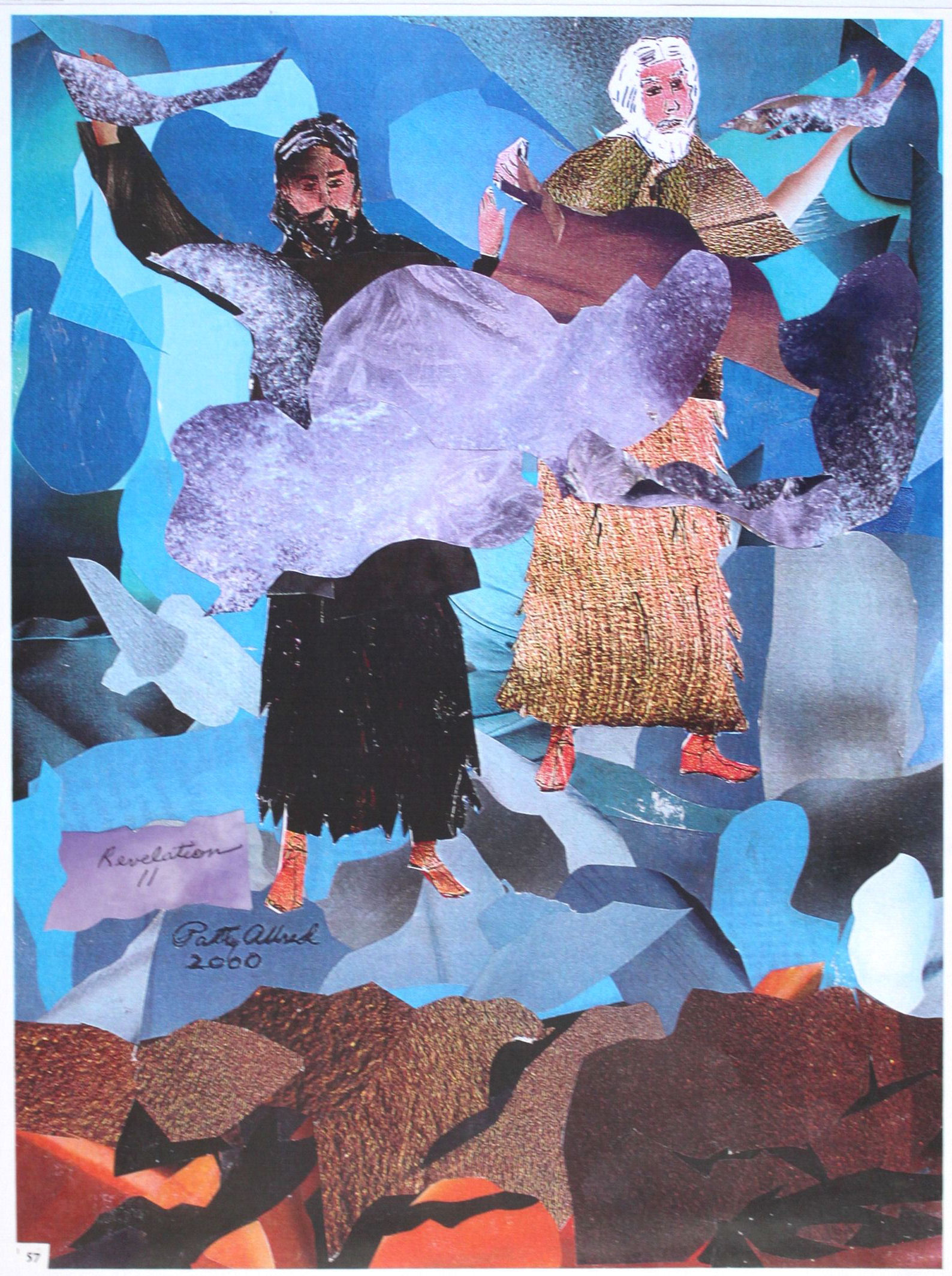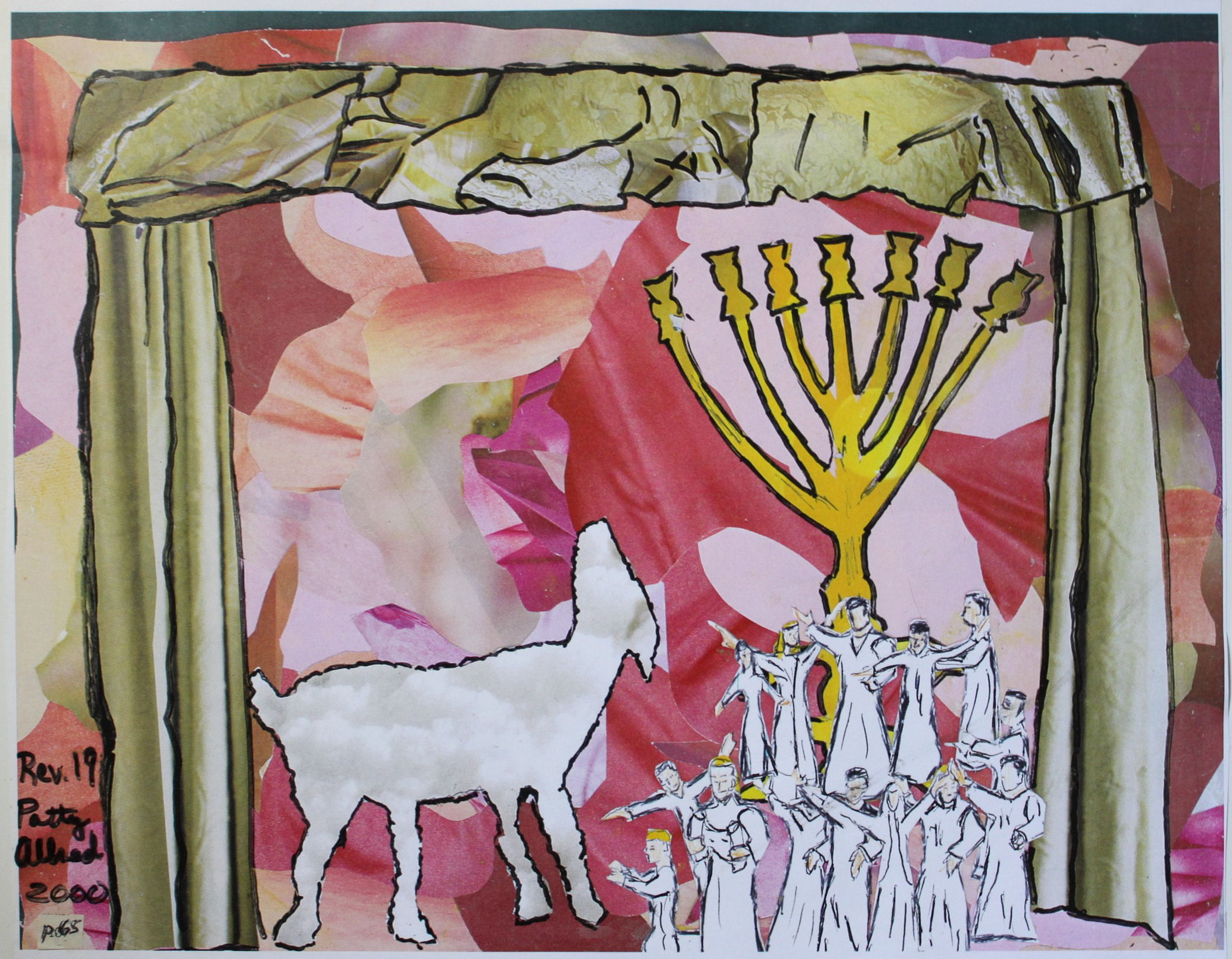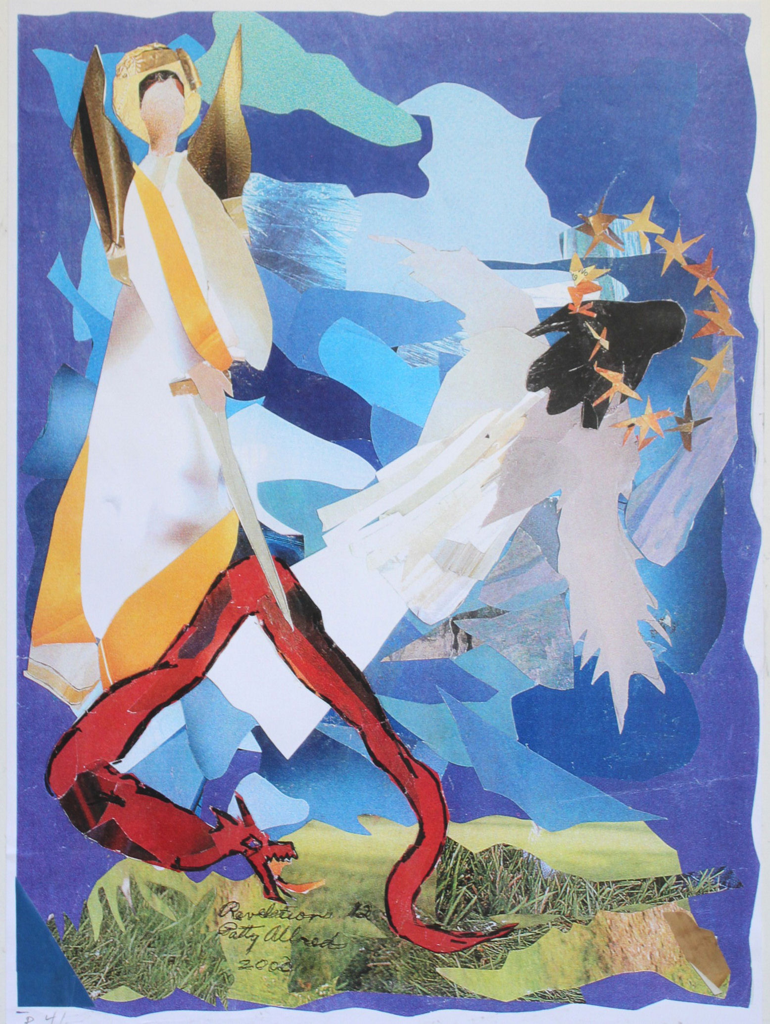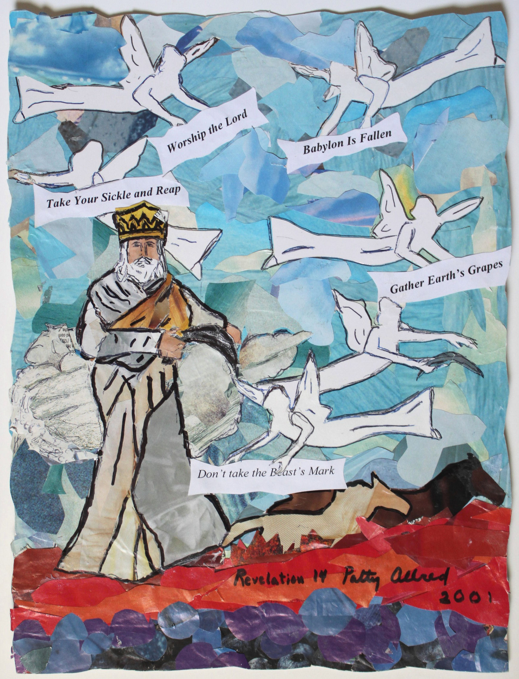 Patty Allred spent much of her energy during the last decade of her life illustrating many scenes in the book of Revelation. She was passionate about Revelation and used a form of collage art to create many illustrations, some of which are no longer available in the original form. More of the pictures are available in black and white in the small independently published book “REVELATION IN PICTURES (Clothed with the Son)” by Patty Allred, ISBN 0-9764619-0-0.