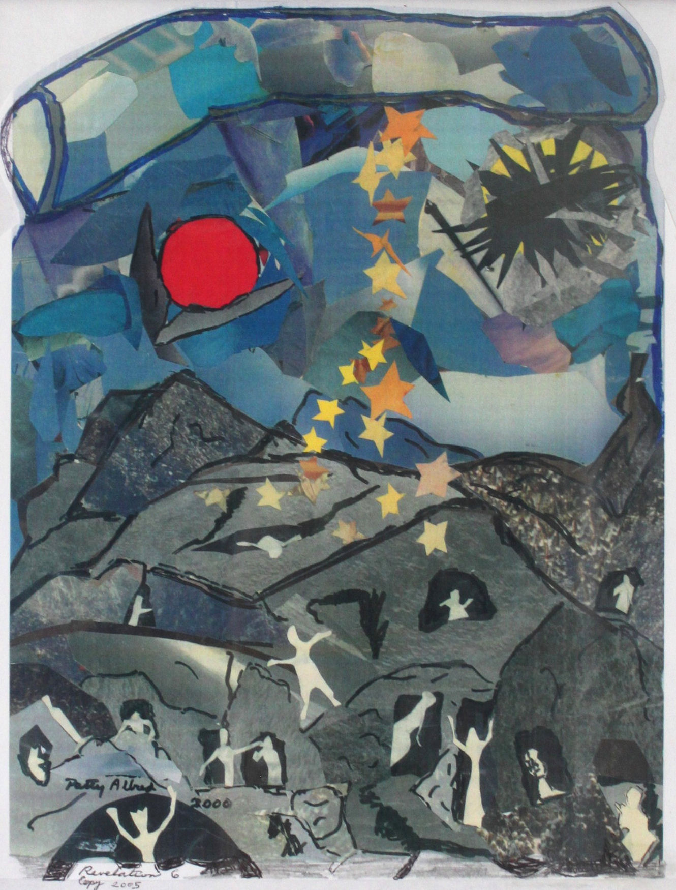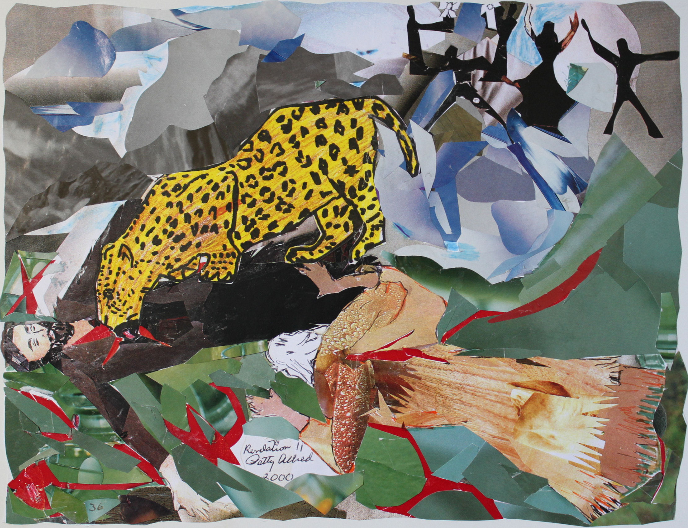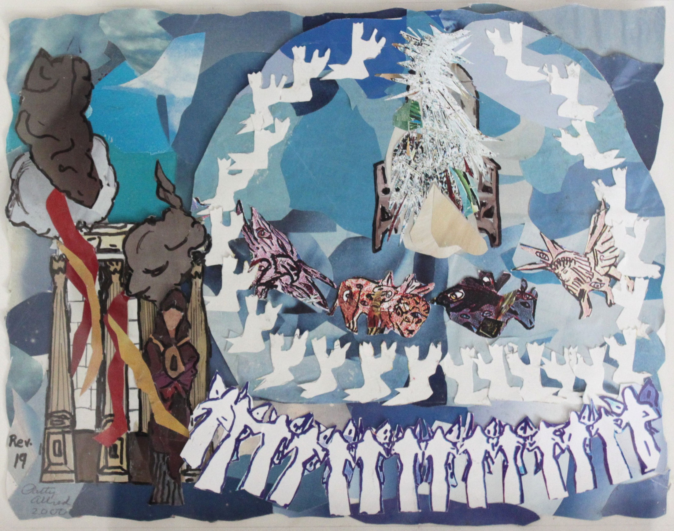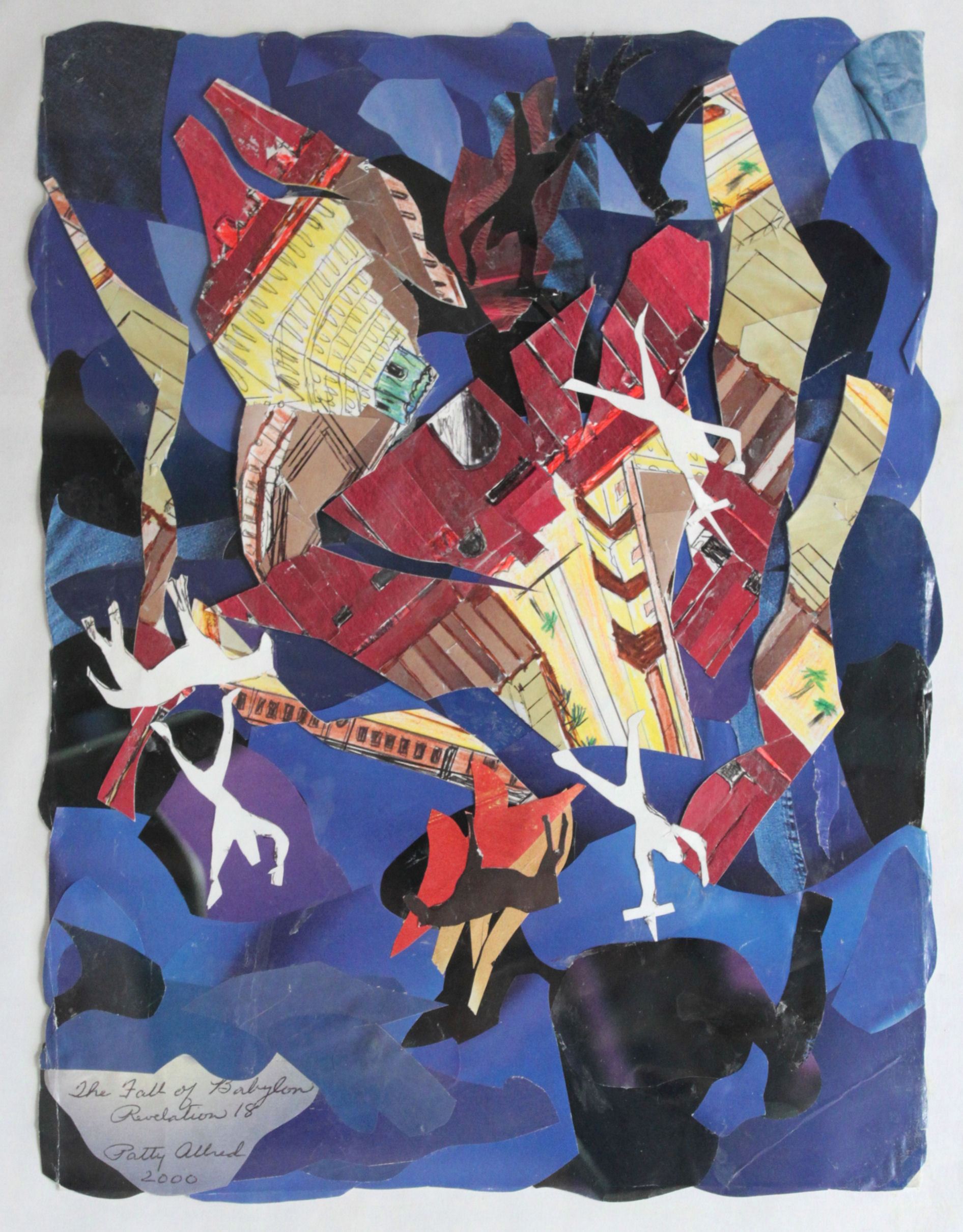 Patty Allred spent much of her energy during the last decade of her life illustrating many scenes in the book of Revelation. She was passionate about Revelation and used a form of collage art to create many illustrations, some of which are no longer available in the original form. More of the pictures are available in black and white in the small independently published book “REVELATION IN PICTURES (Clothed with the Son)” by Patty Allred, ISBN 0-9764619-0-0.