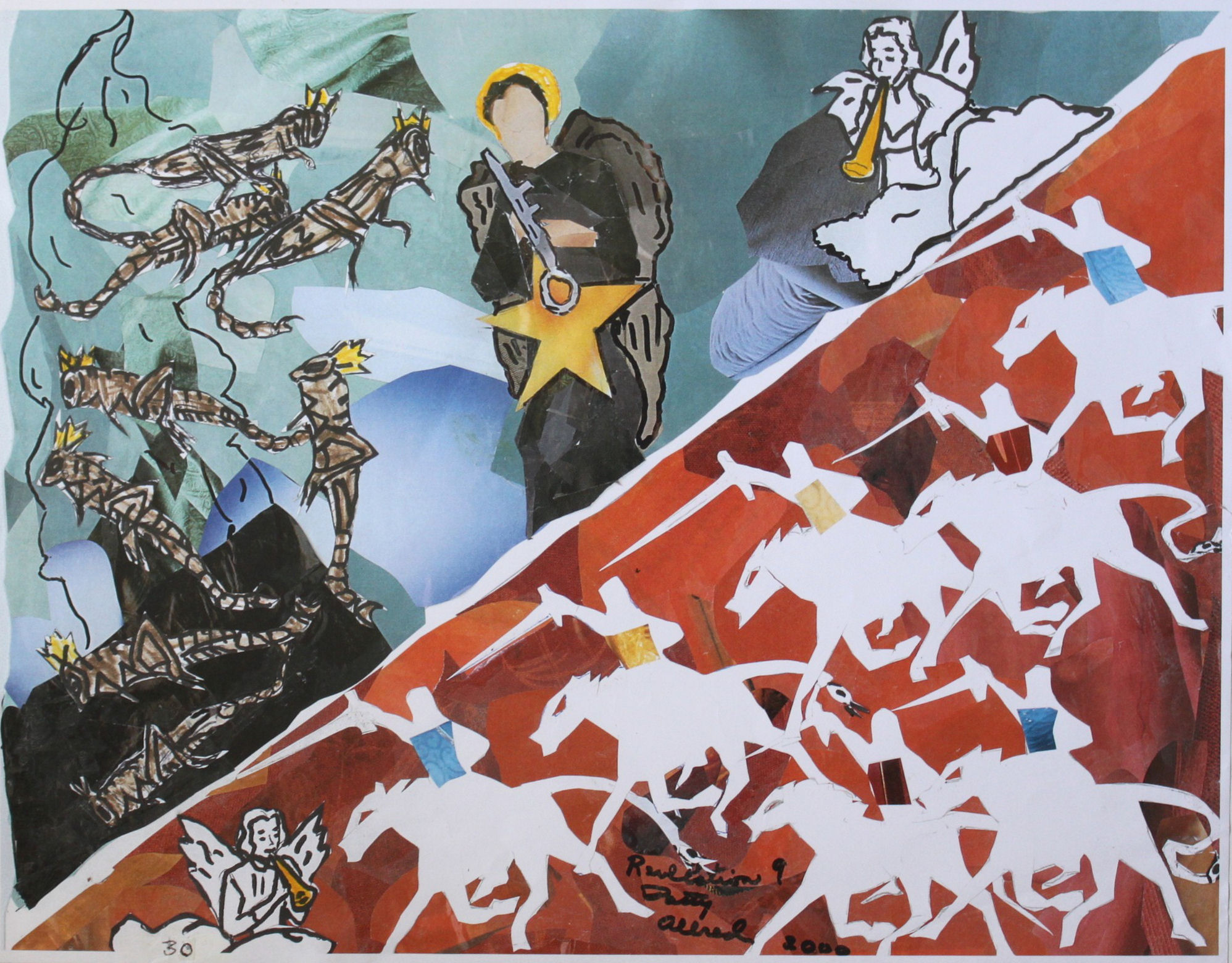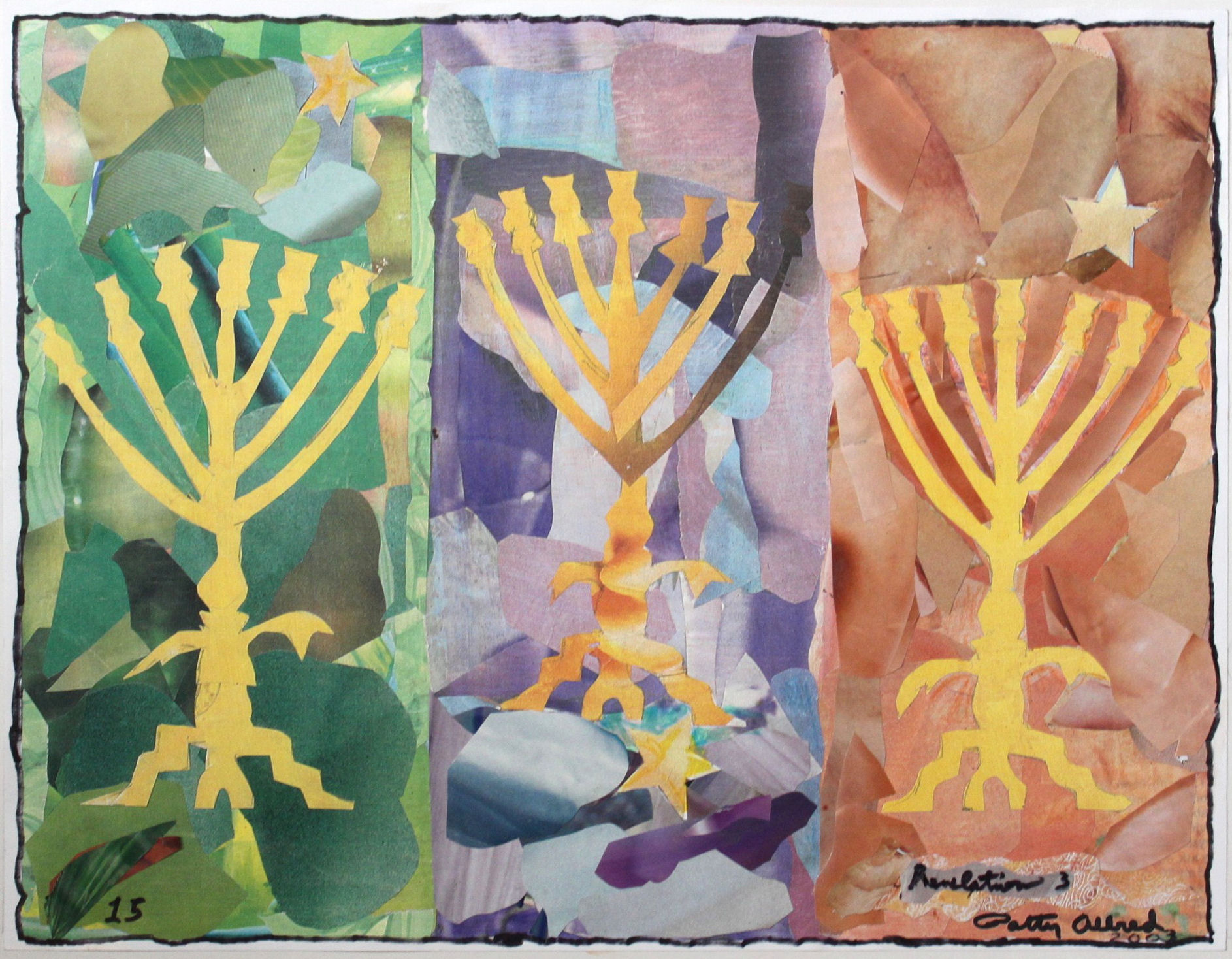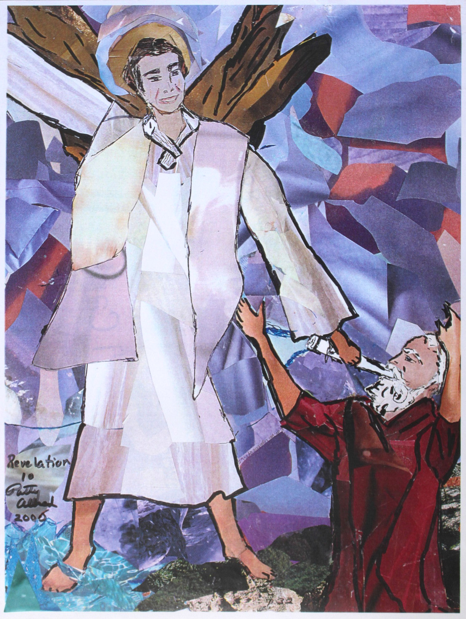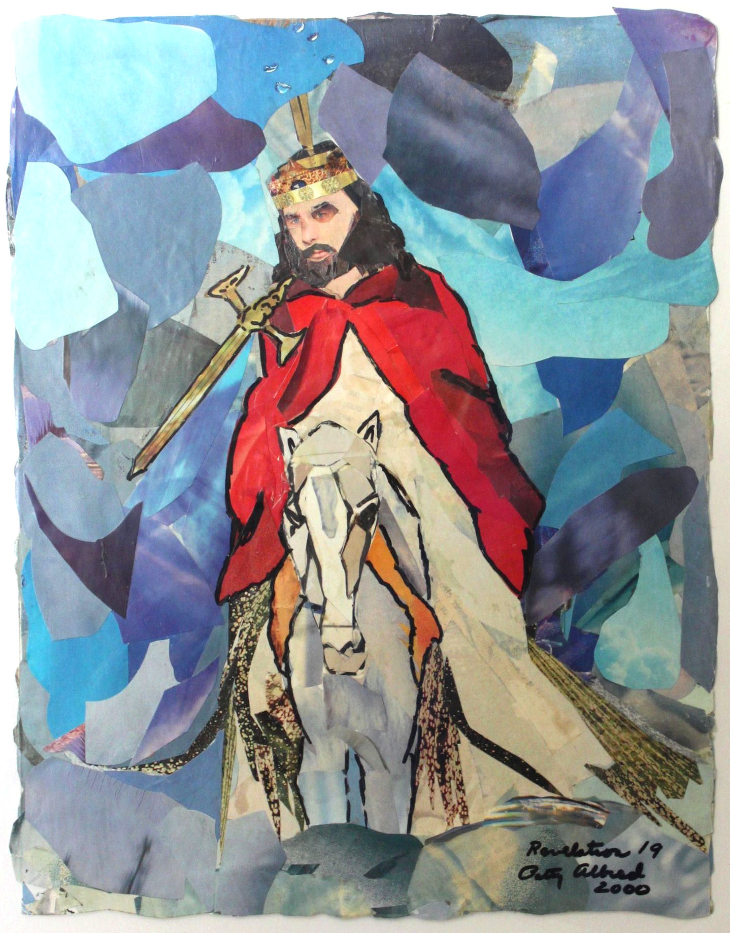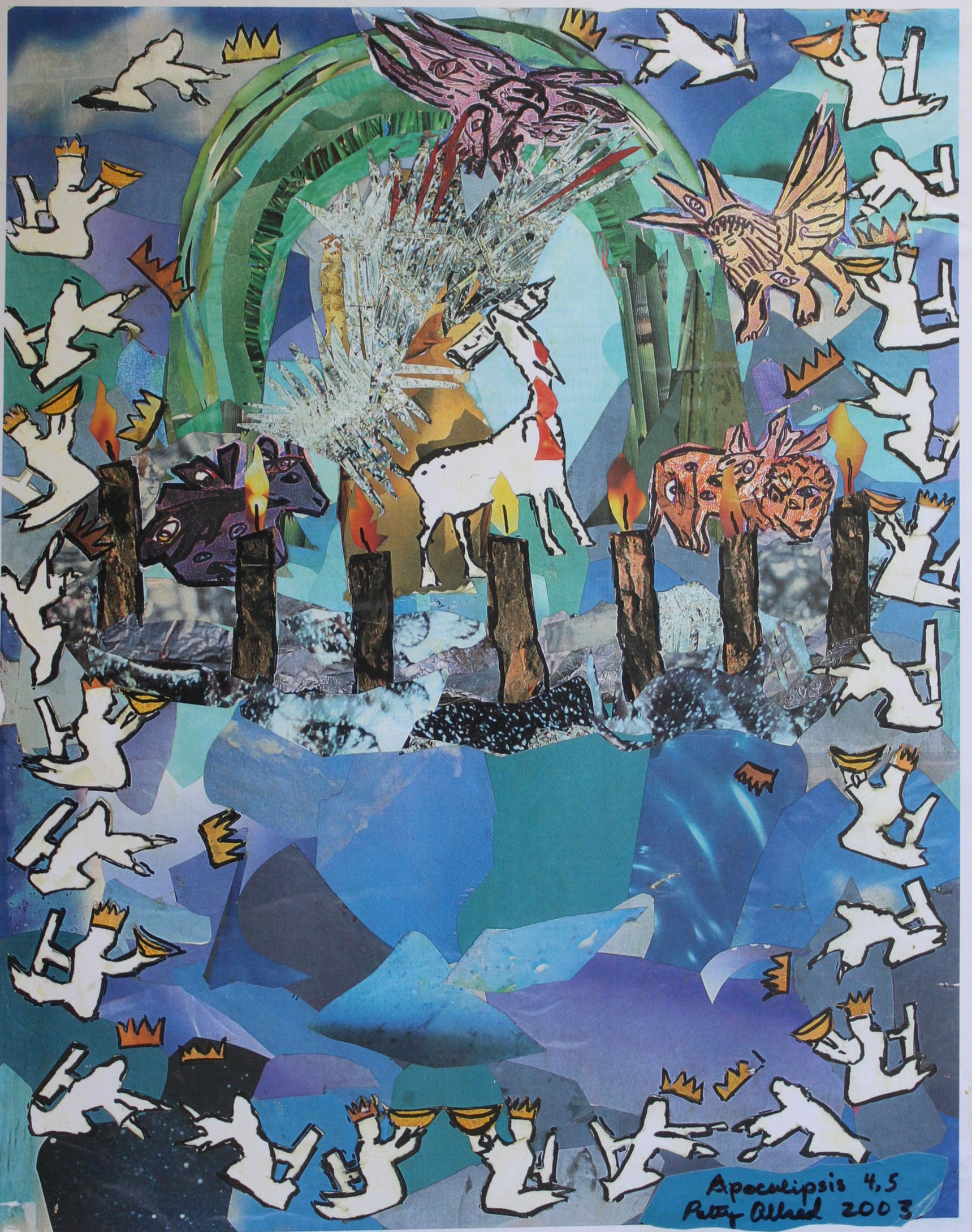 Patty Allred spent much of her energy during the last decade of her life illustrating many scenes in the book of Revelation. She was passionate about Revelation and used a form of collage art to create many illustrations, some of which are no longer available in the original form. More of the pictures are available in black and white in the small independently published book “REVELATION IN PICTURES (Clothed with the Son)” by Patty Allred, ISBN 0-9764619-0-0.