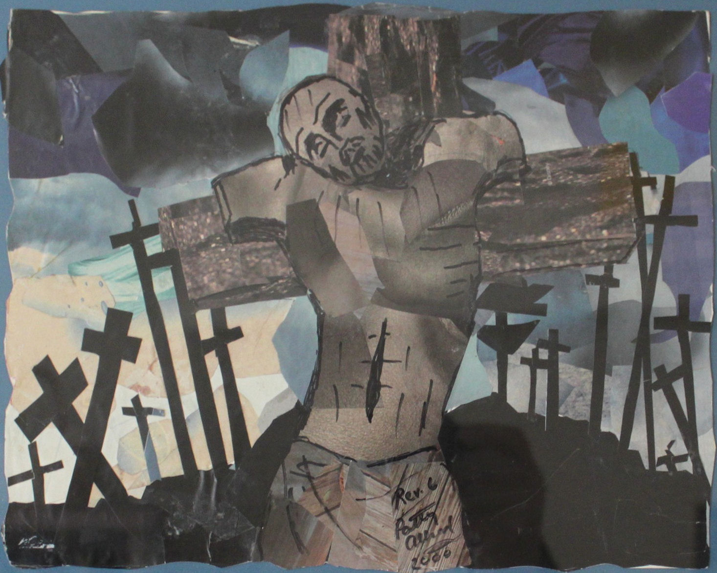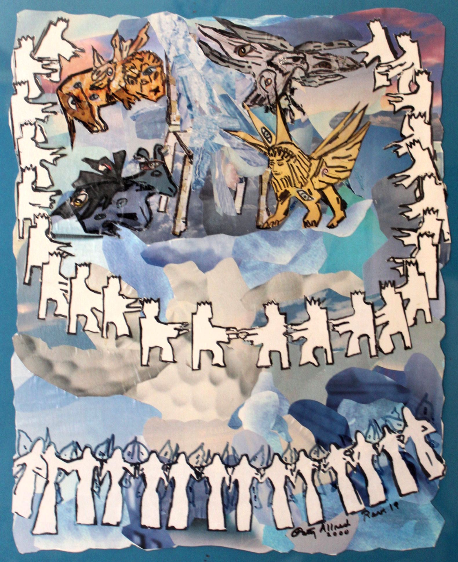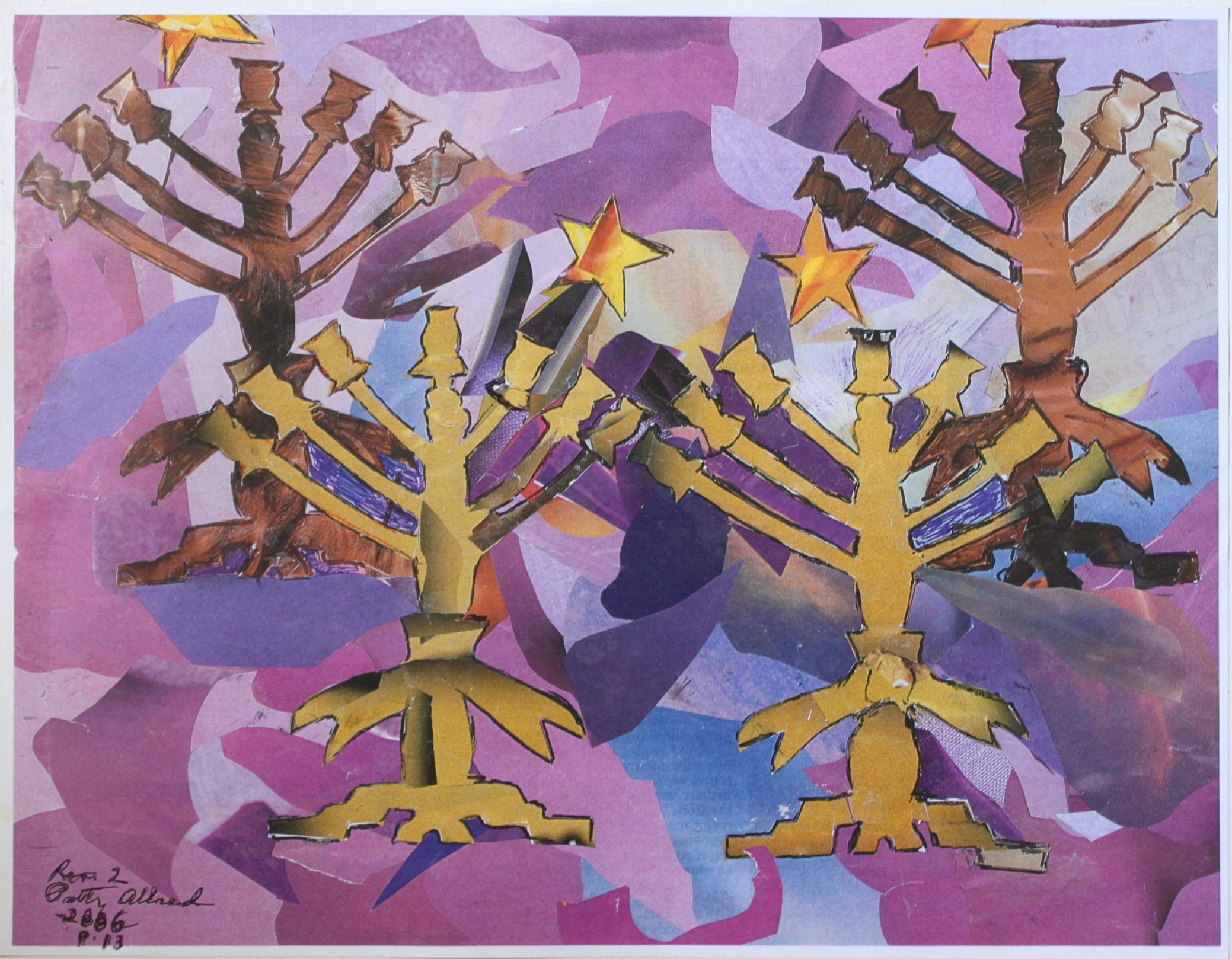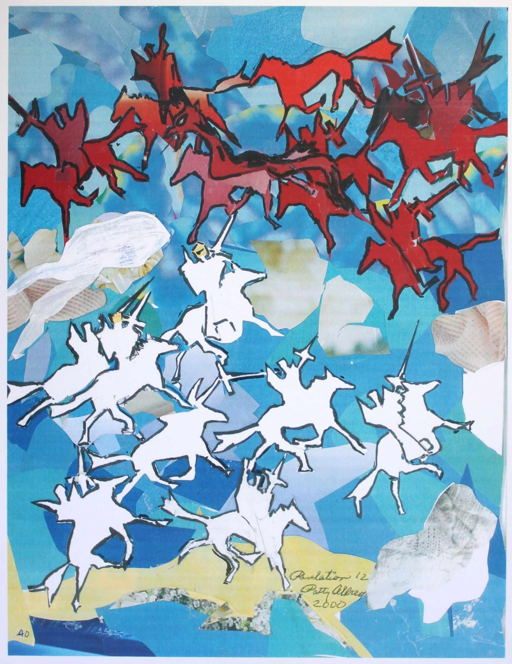 Patty Allred spent much of her energy during the last decade of her life illustrating many scenes in the book of Revelation. She was passionate about Revelation and used a form of collage art to create many illustrations, some of which are no longer available in the original form. More of the pictures are available in black and white in the small independently published book “REVELATION IN PICTURES (Clothed with the Son)” by Patty Allred, ISBN 0-9764619-0-0.